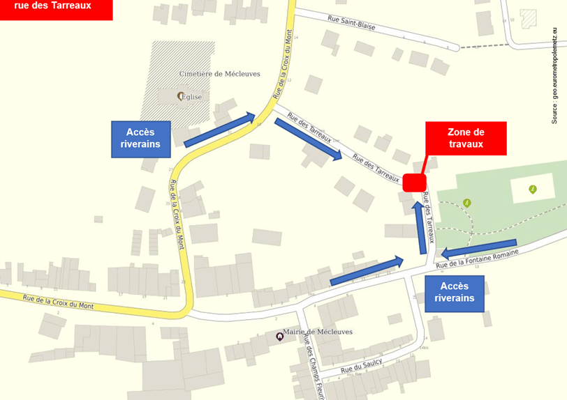 La rue des Tarreaux sera barrée. L'accès aux habitations se fera par la rue de la Croix du Mont ou par la rue de la Fontaine Romaine suivant la situation des habitations par rapport au chantier. Le stationnement sera interdit au droit du chantier. Les accès aux garages pourront être perturbés selon l'avancement des travaux.